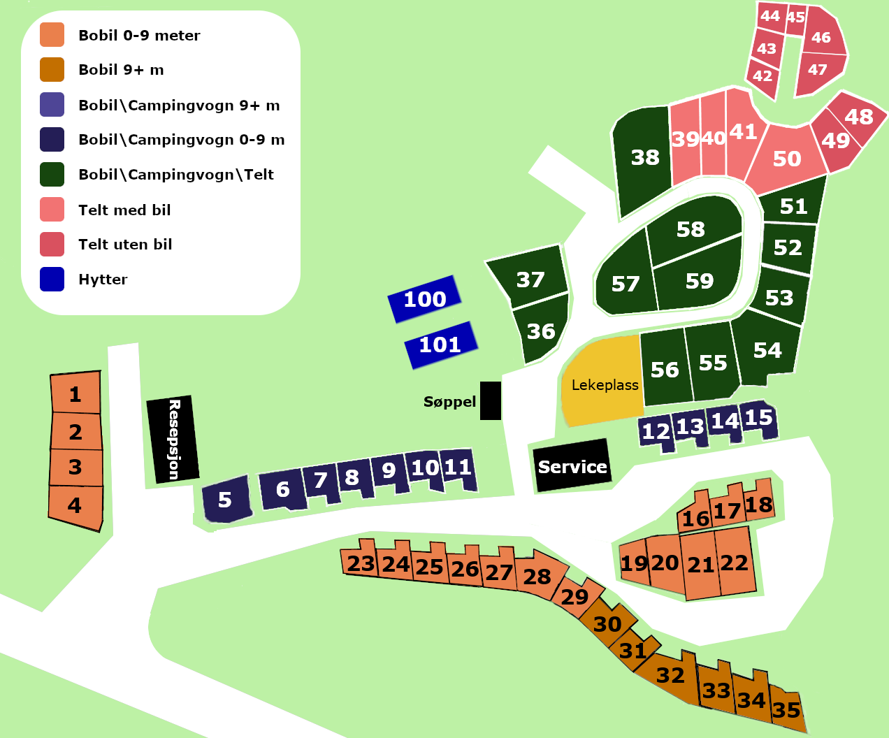 - Campingvogner under 9 meter kan booke plass 5 – 15. Disse koster 495 kr per natt. Alternativt kan plassene for større vogner også benyttes.